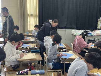 4年生の図工の授業のようすです。彫刻刀を使って版画の作品作りに取り組んでいました。イメージ通りの刷り上がりになるか楽しみですね。