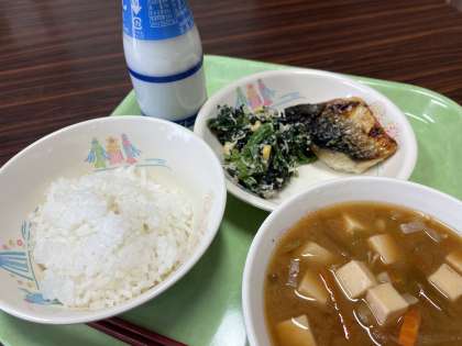 ごはん、牛乳、さばの塩焼き、ひじきとささみのあえもの、里いものみそ汁