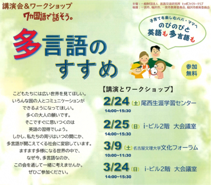 2月8日(木) 多言語のすすめ【学校外からのお知らせ】 公開日 2024/02/08 更新日 2024/02/08 学校外からのお知らせ 地域の方から講演会とワークショップの紹介をいただきましたので、ウェブ記事でも皆さんにお知らせします。 ➡チラシはこちらから
