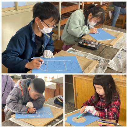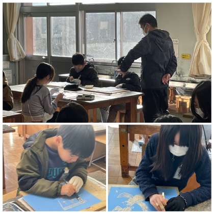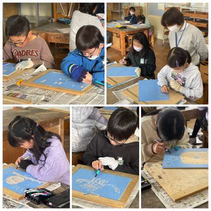2月8日(木) 4年 ほってすって見つけて 公開日 2024/02/08 更新日 2024/02/08 4年 4年生の図工の授業のようすです。彫刻刀を使って版画の作品作りに挑戦していました。とても集中して、ひと掘りひと掘り進めていましたね。