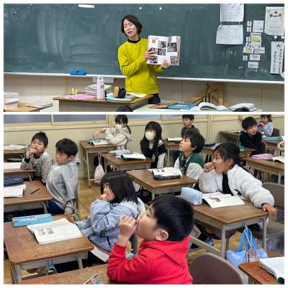 1年4組の国語の授業のようすです。先生に本を読んでもらいながら、他の動物の赤ちゃんについて知っていることを伝え合っていました。