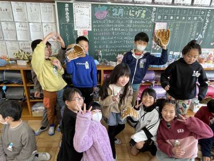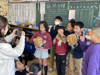 2月8日(木) 3年 教室にグローブがやってきた! 公開日 2024/02/08 更新日 2024/02/08 3年 大谷選手のグローブが3年生の教室にやってきました。はめてみた感想はどうだったかな。おうちの人にも教えてあげようね。