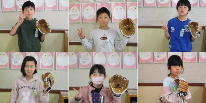 2月8日(木) 3年 教室にグローブがやってきたよ! 公開日 2024/02/08 更新日 2024/02/08 3年 3年生の教室に大谷選手のグローブが回ってきましたよ!かっこよくポーズが決まりましたね。