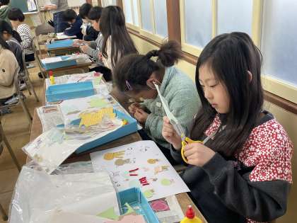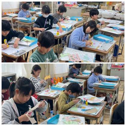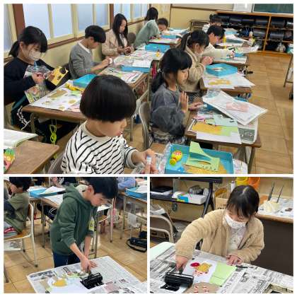3年生の図工の授業のようすです。版画の作品作りに取り組んでいました。インクをつけるときにドキドキしますね。イメージ通りの作品に仕上がるか楽しみです。