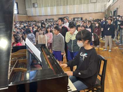2月13日(火) 見守り隊のみなさんに感謝の気持ちを伝える会 公開日 2024/02/13 更新日 2024/02/13 ボランティア 朝の時間を使って児童集会を行いました。いつもボランティアでひがしっ子の登校を見守ってくださっている地域の方をお招きし、みんなで「ありがとう」の気持ちを伝えました。心をこめて校歌を歌い、感謝の首飾りメダルを送りました。まだまだ寒い日が続きますが、これからもずっと元気にひがしっ子を見守り応援していただけるとうれしいです。