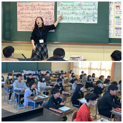 6年1組の音楽の授業のようすです。「旅立ちの日に」の歌の練習をしていました。どの部分をどんなふうに工夫したり、響きを意識したりして歌い上げていくか、先生からポイントを聞き、試し歌いをしながら確認していきました。