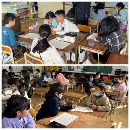 4年生の国語の授業のようすです。「自分の考えを伝える文章を工夫して書こう」というめあてで書いた文章をグループで読み合って、まとめていました。