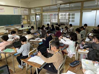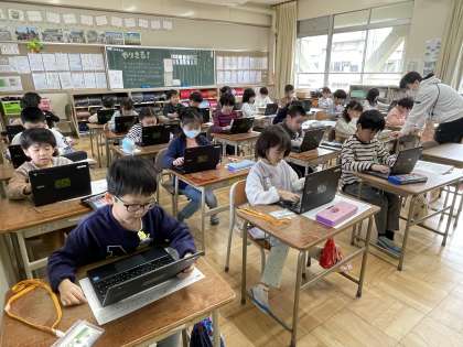 2年生の学級の時間のようすです。算数のプリントに挑戦して終わった人から、クロムブックを使って算数の問題やプログラミング、ひらがなの入力練習などに取り組んでいました。