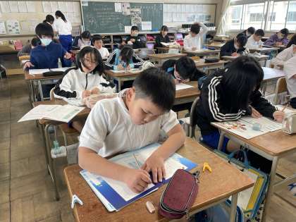 3月6日(水) 5-3 お礼の手紙 公開日 2024/03/06 更新日 2024/03/06 5年 5年3組の書写の授業のようすです。「工場見学のお礼の手紙」の例文を書写して、手紙を書く時のポイントをつかんでいました。
