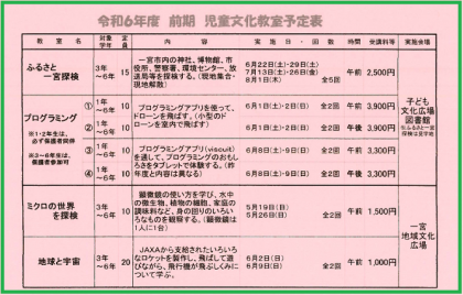 3月8日(金) 令和6年度前期・児童文化教室の募集 公開日 2024/03/08 更新日 2024/03/08 学校外からのお知らせ 一宮市立図書館の館長さんから令和6年度前期児童文化教室の募集案内をいただきましたので、ウェブ記事でも紹介します。興味深い講座がたくさんあります。楽しく充実した休日を過ごすための選択肢の1つにしてみてはいかがでしょうか。 ➡募集チラシはこちらから