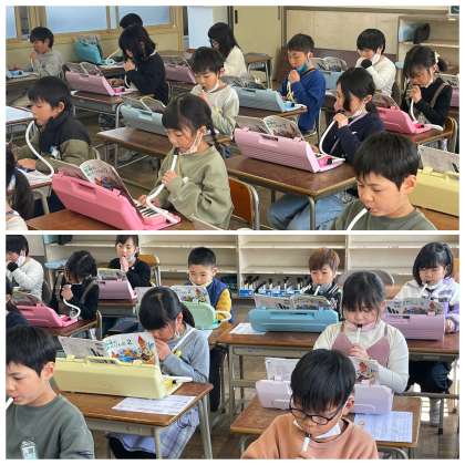 2年生の音楽の授業のようすです。「かえるのがっしょう」や「かっこう」など、2年生で学んだ歌をけん盤ハーモニカで演奏しました。先生の伴奏に合わせて上手に演奏して、けん盤ハーモニカを楽しむことができましたね。