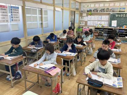 2年生の書写の授業のようすです。「文字の形や書くいちに気をつけて書こう」というめあてで学習を進めていました。