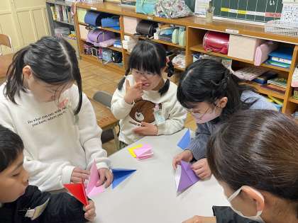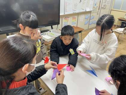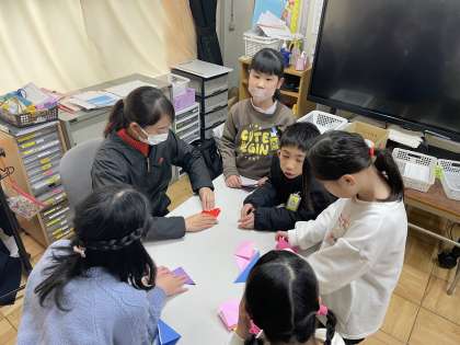 ひまわり組さんの今日の活動のようすです。色紙を使って口から風を吹きかけて回るコマを作っていました。上手にふちを合わせて色紙を折ることができましたね。
