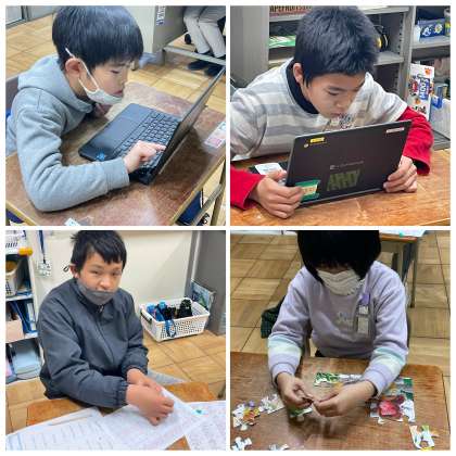 3月12日(火) 今日のひまわりさん 公開日 2024/03/12 更新日 2024/03/12 ひまわり組 ひまわり組さんの今日の活動のようすです。漢字や計算の練習プリント、クロムブックを使った文字の学習、パズルなどに一生懸命取り組んでいました。