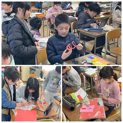 3月13日(水) 4年 カードで伝える気持ち 公開日 2024/03/13 更新日 2024/03/13 4年 4年生の図工の授業のようすです。とび出すカードの仕上げの時間のようでした。感謝の気持ちが伝わるように、心をこめて丁寧に作り上げていましたね。