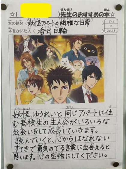 3月24日(日) 本に親しもう!【先生からの紹介】 公開日 2024/03/24 更新日 2024/03/24 ひがしっ子ライフ 図書館前の掲示物より、ひまわり2組の先生からの本の紹介です。本は心の栄養です。新しい学年が始まったら、ぜひたくさんの本に出会って、読書を楽しんでくださいね。