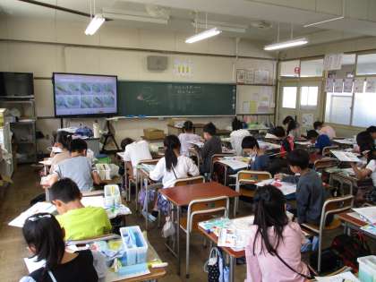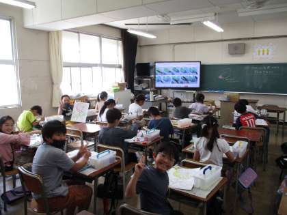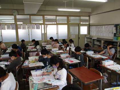 4年生では図画工作でグラデーションを使って花の色を塗っています。色の変化をつけながら綺麗にぬれたかな。