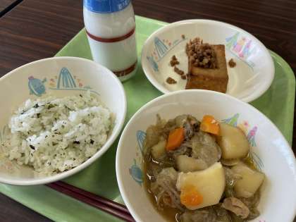 4月19日(金) 今日もおいしくいただきま〜す! 公開日 2024/04/19 更新日 2024/04/19 ひがしっ子ライフ 今日の給食のメニューを紹介します。 わかめごはん、ぎゅうにゅう、きぬあつあげのそぼろあんかけ、にくじゃが