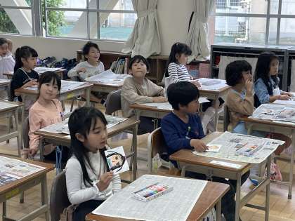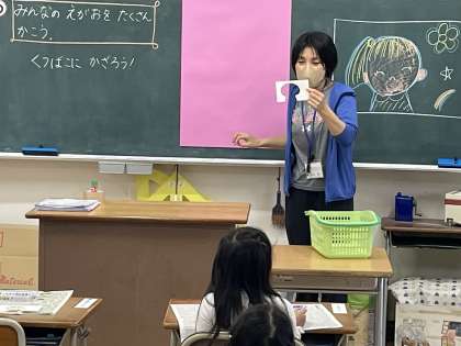 5月1日(水) 1-1 かおをえがこう 公開日 2024/05/01 更新日 2024/05/01 1年 1年1組の図工の授業のようすです。「みんなのえがおをたくさんかこう」というめあてで学習を進めていました。