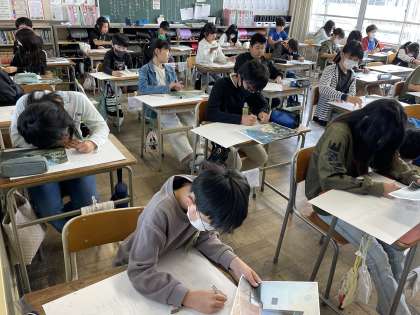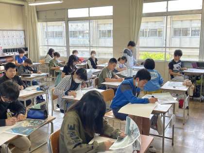 6年生の昨日の図工の授業のようすです。写生画の下書きに取り組んでいました。お気に入りの場所を想いをこめて描こうとがんばっていましたね。