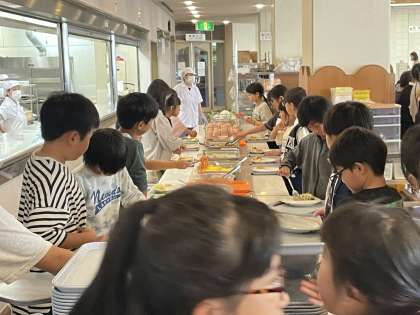 5月24日(金) 5年 野外教育活動のようす 公開日 2024/05/24 更新日 2024/05/24 5年 お部屋の点検が終わった班から朝ごはんです。バイキングのメニューはオムレツやシューマイ、スパゲティなどがありました。みんなで美味しくいただきました♪
