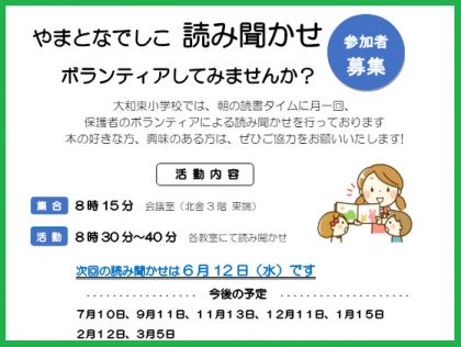 5月28日(火) 『なでしこフォーラム』を紹介します 公開日 2024/05/28 更新日 2024/05/28 ボランティア 5月15日(水)に読み聞かせボランティアの「やまとなでしこ」による今年度第1回目の読み聞かせを行っていただきました。今回は1年生・2年生・4年生・5年生・ひまわり学級で行われました。活動の内容を紹介した「なでしこフォーラム」をいただきましたので、昨日tetoru配信しました。ウェブ記事でも紹介します。 ➡なでしこフォーラムはこちらから