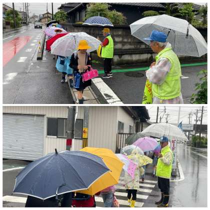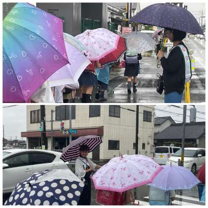 雨の中での登校となりました。足元の悪い中、早くからPTA旗ボランティアさんや地域見守り隊のみなさんが子どもたちを交差点でむかえ、安全に横断できるようにサポートしていただきました。ありがとうございました。