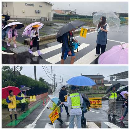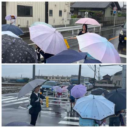 朝の見守り活動のようすスナップです。雨にぬれながらも「思っていたよりも雨が少なくてよかったですね」と声をかけていただき、大変ありがたく感じました。