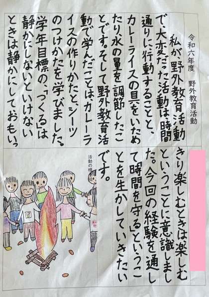 6月5日(水) 5年ウェブ展覧会「野外教育活動」 公開日 2024/06/05 更新日 2024/06/05 5年 5年生の教室の掲示物を紹介します。野外教育活動の感想です。どんな感想をもち、自分の成長につなげようとしてくれているかな。