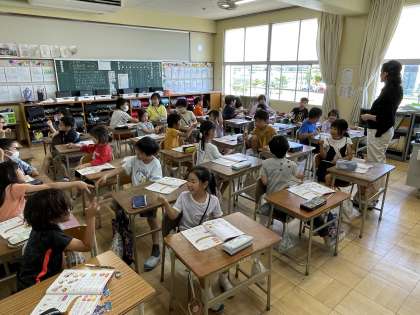 6月4日(火) 3年 Let's play! 公開日 2024/06/04 更新日 2024/06/04 3年 3年生の外国語活動の授業のようすです。「じゃんけんしよう」という課題で、ペアで英語の表現のじゃんけんを楽しんでいました。