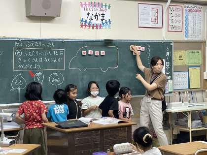 1年生の算数の授業のようすです。「ふえたりへったりするおきゃくさんは、なんにんかかんがえよう」というめあてで学習を進めていました。数図ブロックや役割演技で何人になったか確認することができましたね。