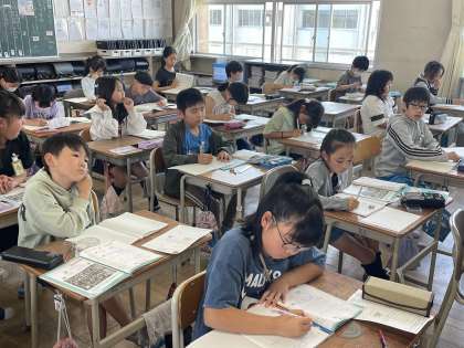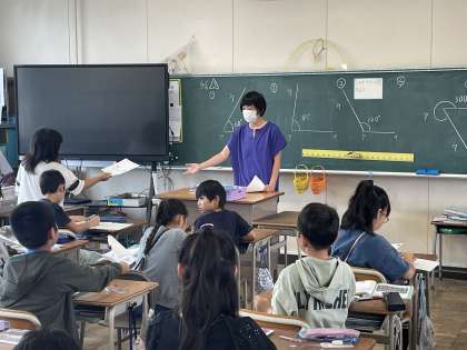 4年生の算数の授業のようすです。「角のもとめ方をたしかめよう」というめあてで、いろいろな問題に挑戦していました。学んだことを生かして、角の求め方をじっくりと考えることができましたね。