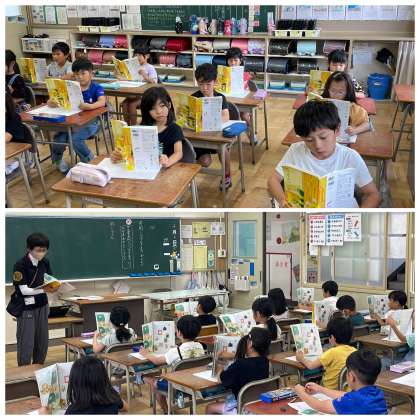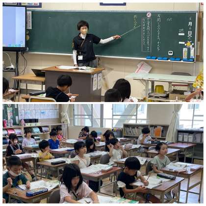 2年生の国語の授業のようすです。「かん字の同じぶぶんを見つけて、なかまわけをしよう」というめあてで学習を進めていました。