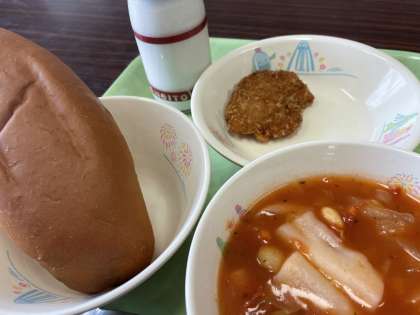 今日の給食は、くろロールパン、ぎゅうにゅう、ささみカツ、ミネストローネでした。