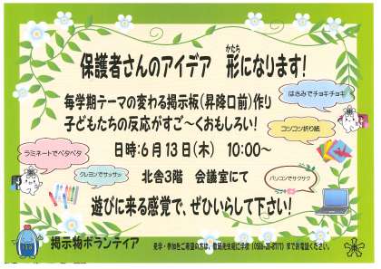 6月7日(金) 6/13の掲示物ボランティアの紹介 公開日 2024/06/07 更新日 2024/06/07 ボランティア 6月13日に掲示物ボランティアのみなさんが活動をされます。 紹介させていただきます。 ボランティアの方から 「ぜひ,一緒に活動しましょう」 とお話がありました。
