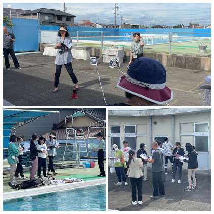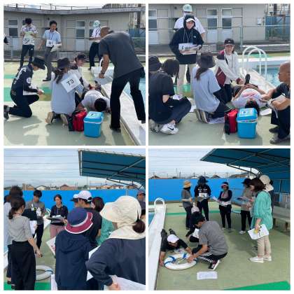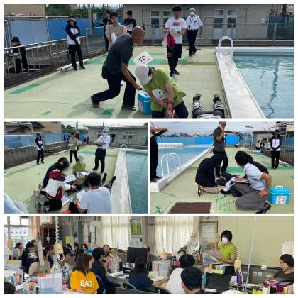 子どもたちが下校した後、職員がプールサイドに集まって現職教育『プール事故シミュレーション』を行いました。2つのグループに分かれて3回役割を交代しながら、緊急事態が発生した場合の応急手当のしかたや緊急連絡体制について確認し、安全管理の意識を高めました。