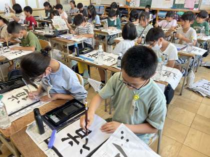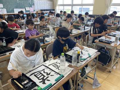 6月14日(金) 5年 文字の組み立て方 公開日 2024/06/14 更新日 2024/06/14 5年 5年生の書写の授業のようすです。「文字の組み立て方と穂先の動きに気をつけて、『道』の文字を書こう」というめあてで筆を運んでいました。