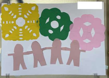 1年生の廊下の掲示物を紹介します。題は『ちょきちょきかざり』です。はさみを使っていろんな形を作りましたよ。楽しく作業をしているようすを思い浮かべながらご覧ください。