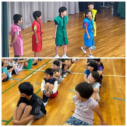 ひまわり組さんの朝の時間のようすです。体育館に集まって、保健委員会さんの発表を聞きました。クイズはどのくらい正解できたかな。楽しく歯について学ぶことができましたね。今日もしっかり歯を磨いて、歯を大切にしていきましょう!