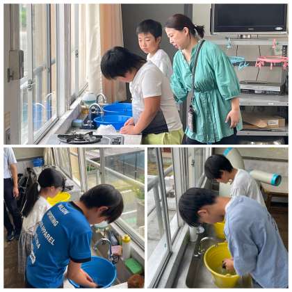 6月26日(水) 6年 きれいに洗おう 公開日 2024/06/26 更新日 2024/06/26 6年 6年生の家庭科の授業のようすです。「手順に気をつけながら、くつ下をきれいに洗おう」というめあてで学習を進めていました。上手に洗うことができたかな。