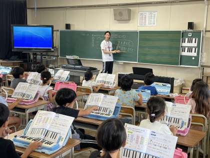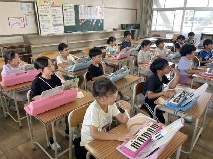 6月26日(水) 2年 音の重なりやリズム 公開日 2024/06/26 更新日 2024/06/26 2年 2年生の音楽の授業のようすです。「音のかさなりやリズムをえらんで合わせよう」というめあてで学習を進めていました。けん盤ハーモニカをつかっていろんな音の重なりを感じることができましたね。