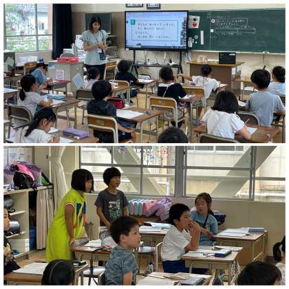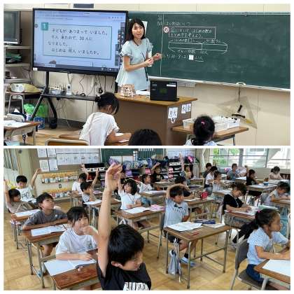 2年生の算数の授業のようすです。「図にかいて、はじめの数のもとめ方を考えよう」というめあてで学習を進めていました。テープ図をつかって考えを深めることができましたね。