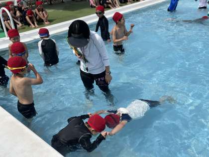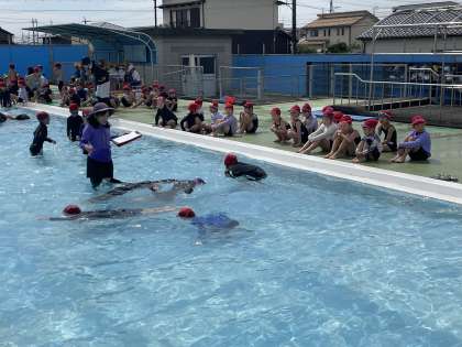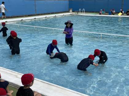 1年生の学年体育の授業のようすです。プールで楽しく活動していました。水の中に顔をつけて、数をかぞえることができました。よくがんばっていましたね。