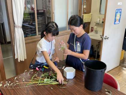本校の小さな生け花先生たちが、今日も校長室を訪れて生け花のお世話をしてくれました。残念ながら2人の先生の手にかかっても、暑さでしおれてしまったお花とお別れせざるを得なかったようです。今までステキな雰囲気を作ってくれた花に感謝の気持ちを伝えながら、片付け作業をしてくれました。また、機会があったらお花を飾ってくれるとうれしいです。これまで本当にありがとうございました!