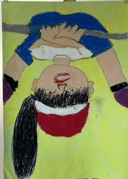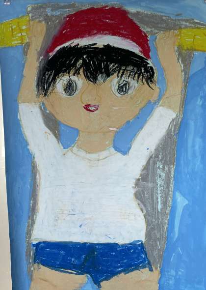 2年生の図工の作品を紹介します。鉄棒する自分のようすを思い浮かべながら、気持ちが伝わるように描きました。
