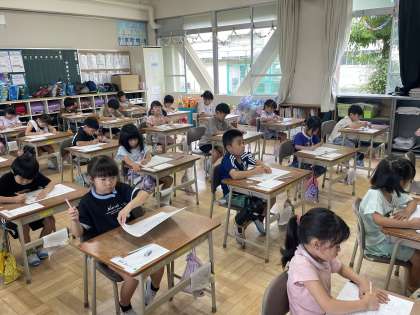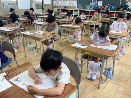 1年2組の国語の授業のようすです。「ひらがなけんてい」に挑戦していました。ていねいに書けるようにがんばっていましたね。