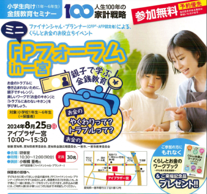 7月12日(金) FPフォーラムin一宮の紹介 公開日 2024/07/12 更新日 2024/07/12 学校外からのお知らせ 地域の方より夏休みのイベントのお知らせをいただきましたので、ウェブ記事でも紹介します。 ➡詳細はチラシPDFをご覧ください。