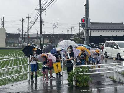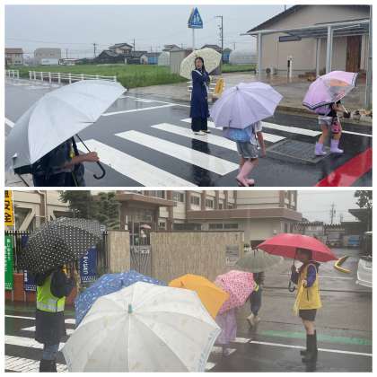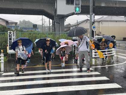 この後、雨は少しずつ弱まる予報ですが、下校も傘をさして移動することになるかもしれません。お時間がありましたら、付き添い下校や家の近くの通学路に出て見守りをしていただけるとうれしいです。