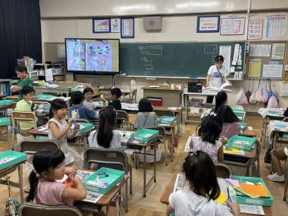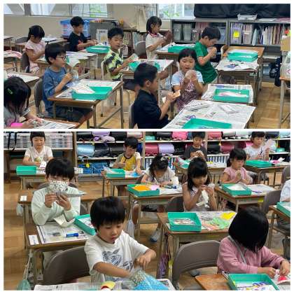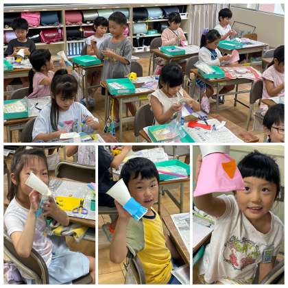 1年生の図工の授業のようすです。「かみこっぷぱっくんをつくろう」というめあてで学習を進めていました。楽しい作品ができましたね。