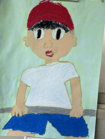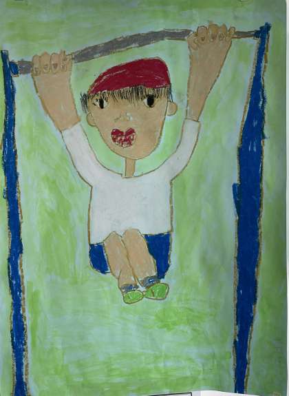 2年生の図工の作品を紹介します。鉄棒する自分のようすを思い浮かべながら、気持ちが伝わるように描きました。